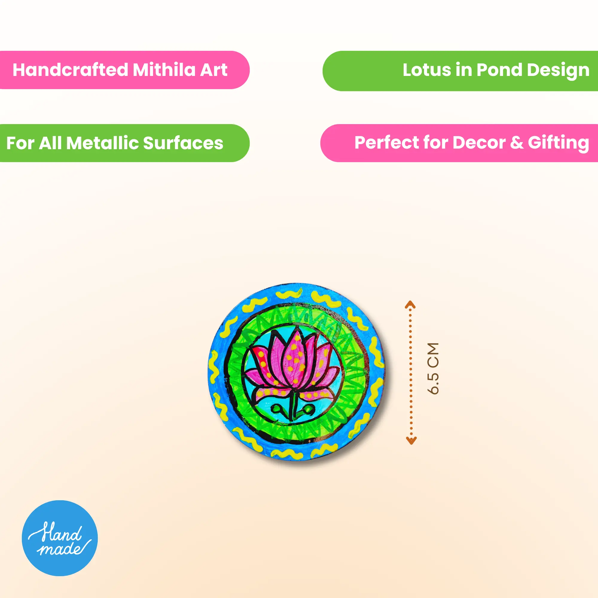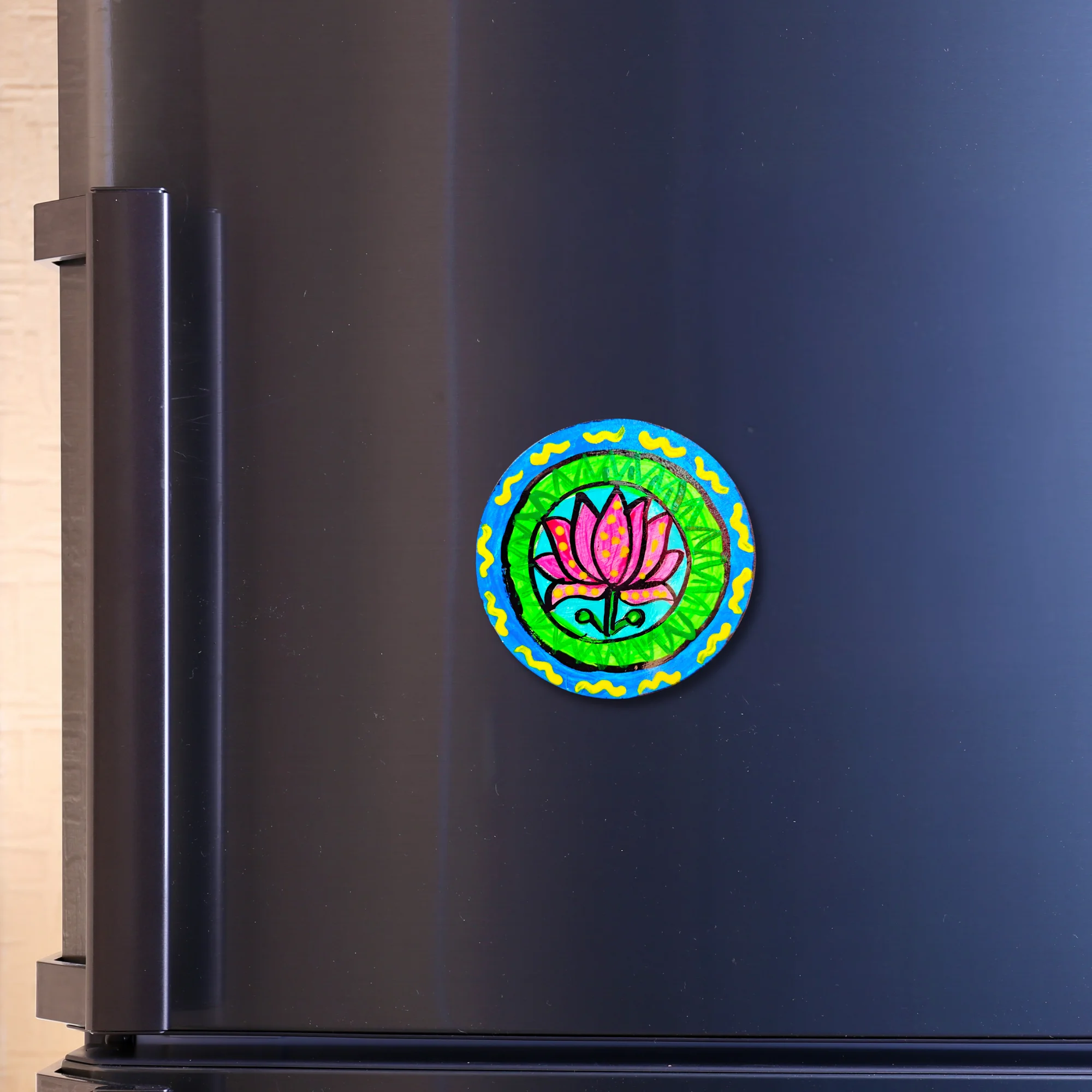 A hand-painted Madhubani lotus fridge magnet symbolising purity and growth in the traditional Mithila art style. Perfect for gifting, kitchen decor, and desk decor.