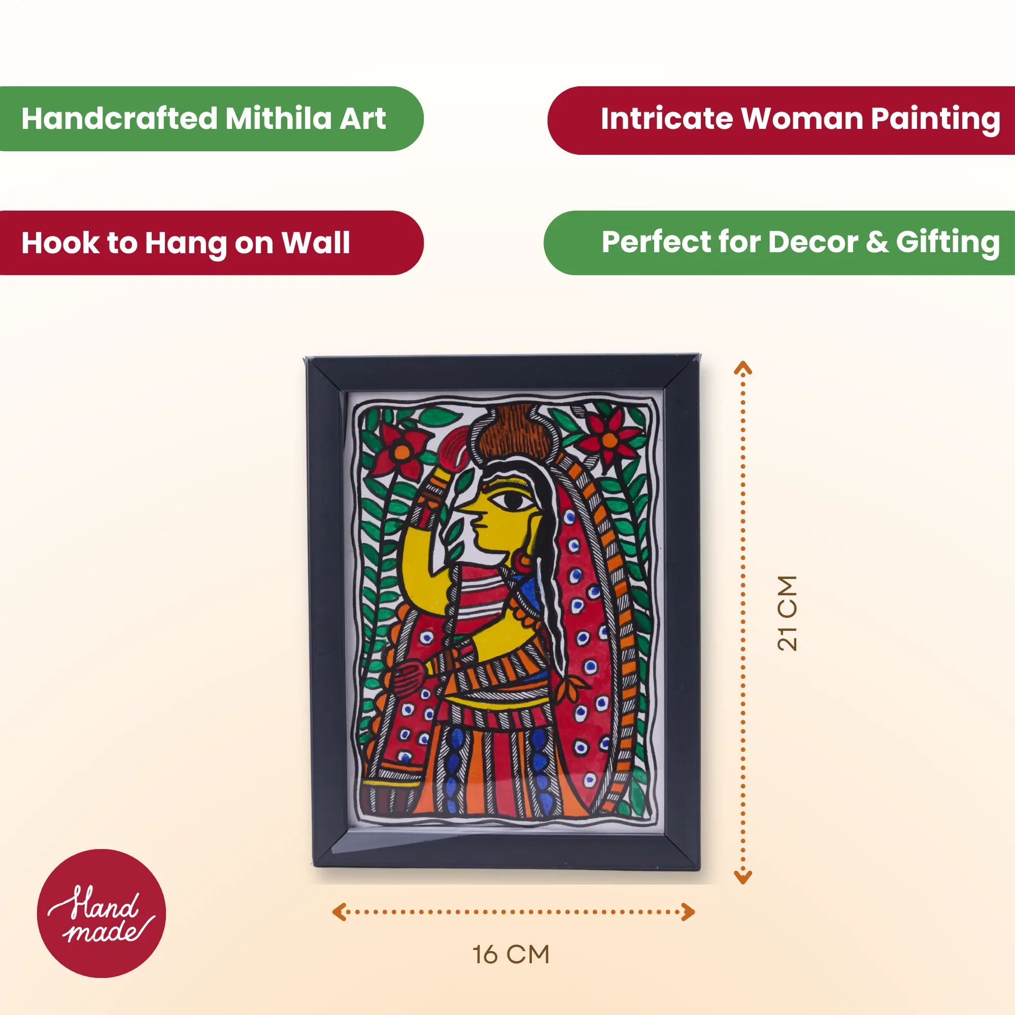 Crafted with fine detailing, bold lines, and intricate patterns, this artwork reflects the cultural richness of Mithila. Perfect for wall décor, gifting, or adding an ethnic touch to your living space, this colorful Madhubani painting of a woman makes a timeless statement.